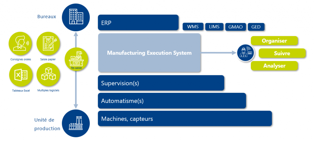 Un MES (Manufacturing Execution System) répond à des problématiques qui existent dans de nombreuses entreprises : une prédominance de consignes orales, du papier et en conséquence un temps important de re-saisie pour obtenir une vision d’ensemble de la production, que ce soit pour la qualité, la traçabilité, l’amélioration continue ou le calcul des prix de revient.